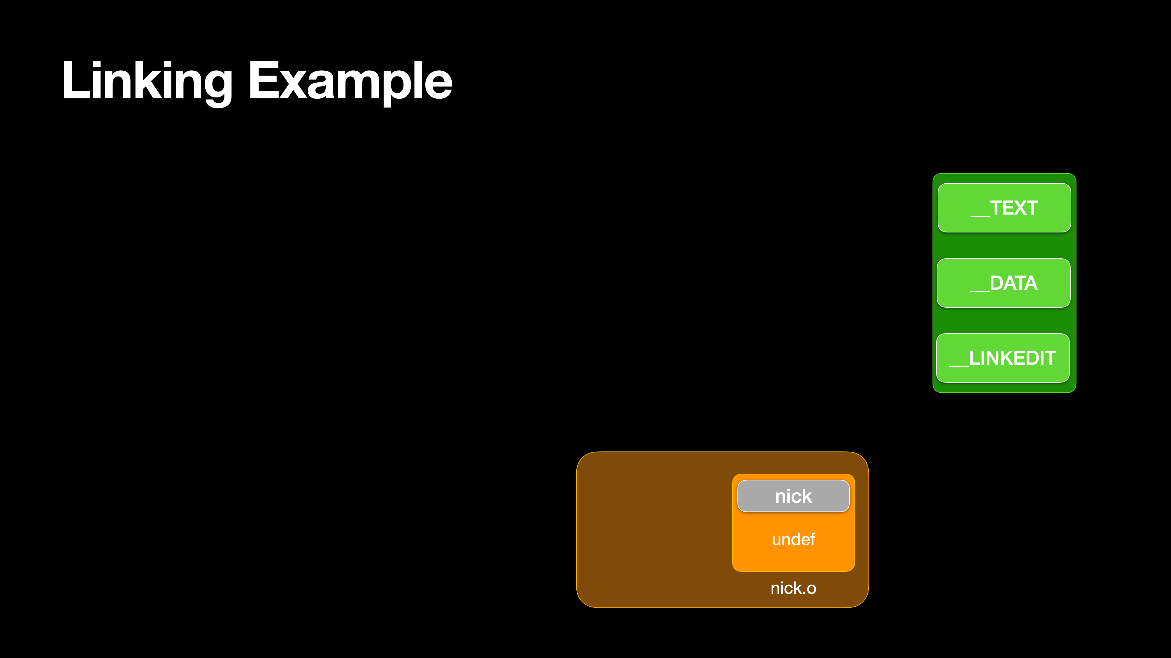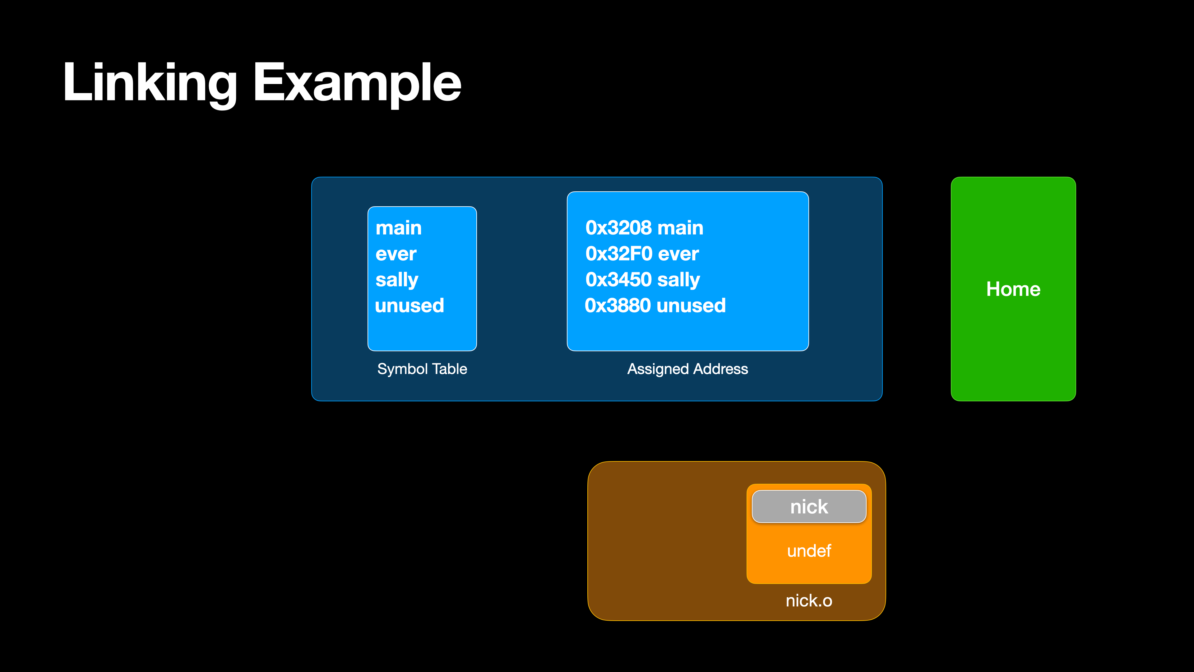 더 이상 해결할 심벌이 없기 때문에 nick.o는 로드되지 않고, Home이라는 실행 가능한 프로그램이 생성된다.