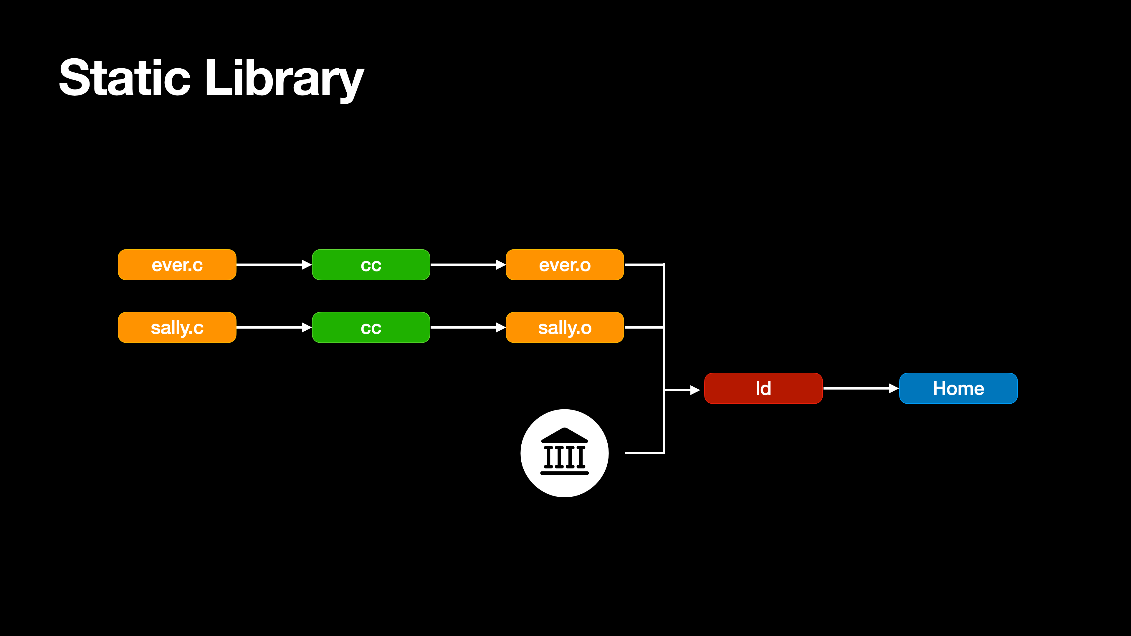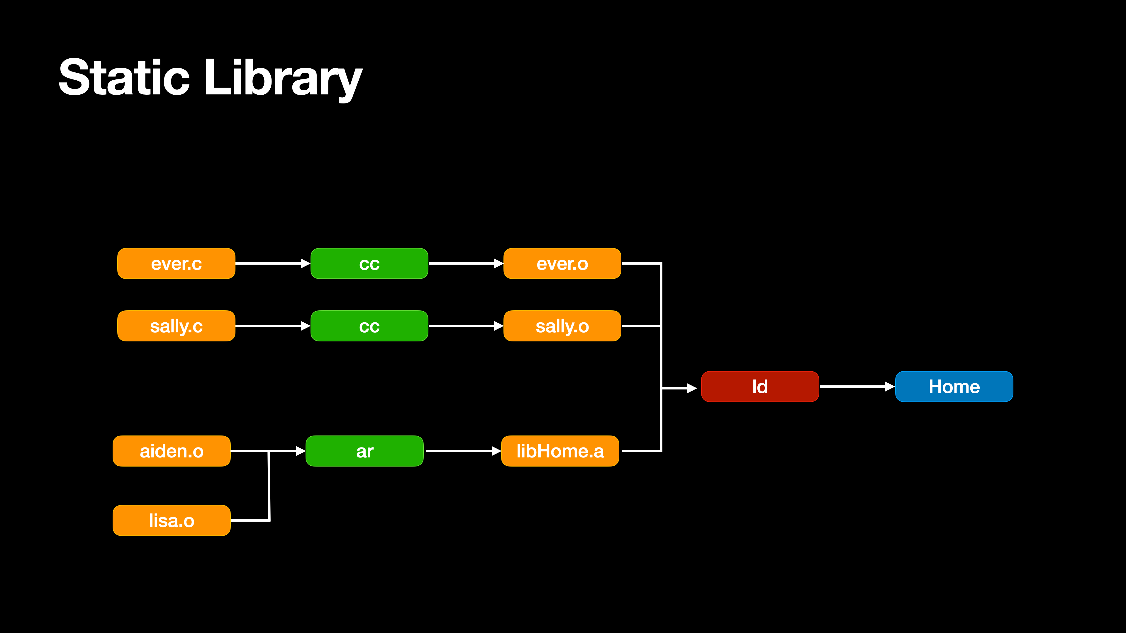 샐리와 닉은 먼저 입사했으니 Static Library로 묶어서 관리하고, 이제 막 입사한 에버는 그대로 둔다.