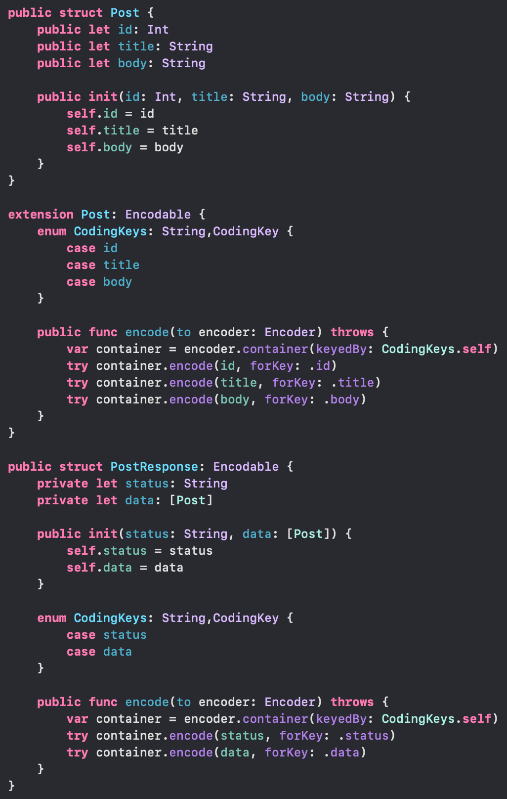 그럼 위와 같이 Post 구조체를 만들 수 있는데, 이제 이 구조체에 대한 배열을 JSON으로 반환하도록 Encodable 프로토콜을 채택하고, PostResponse 구조체를 만들어 인코딩할 수 있도록 하면 될 것 같다.