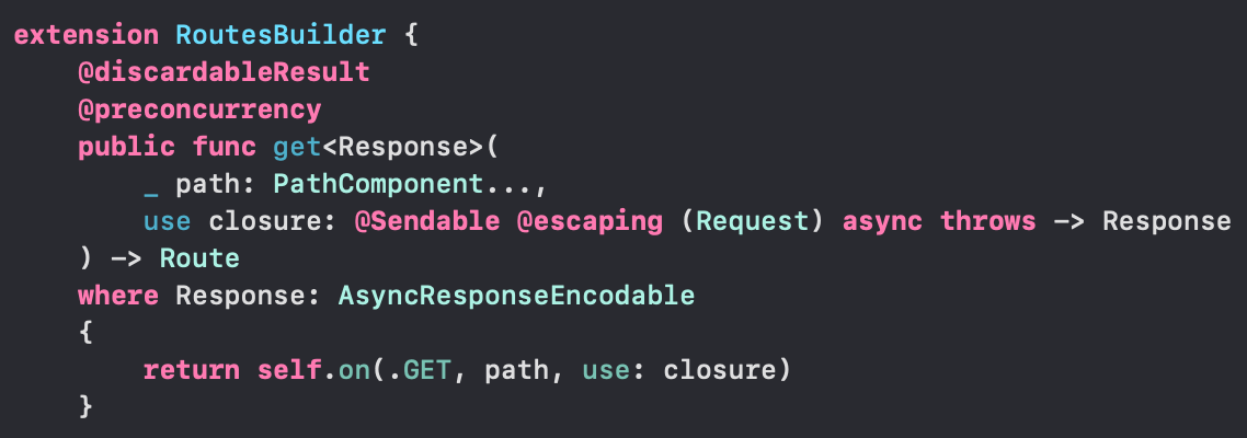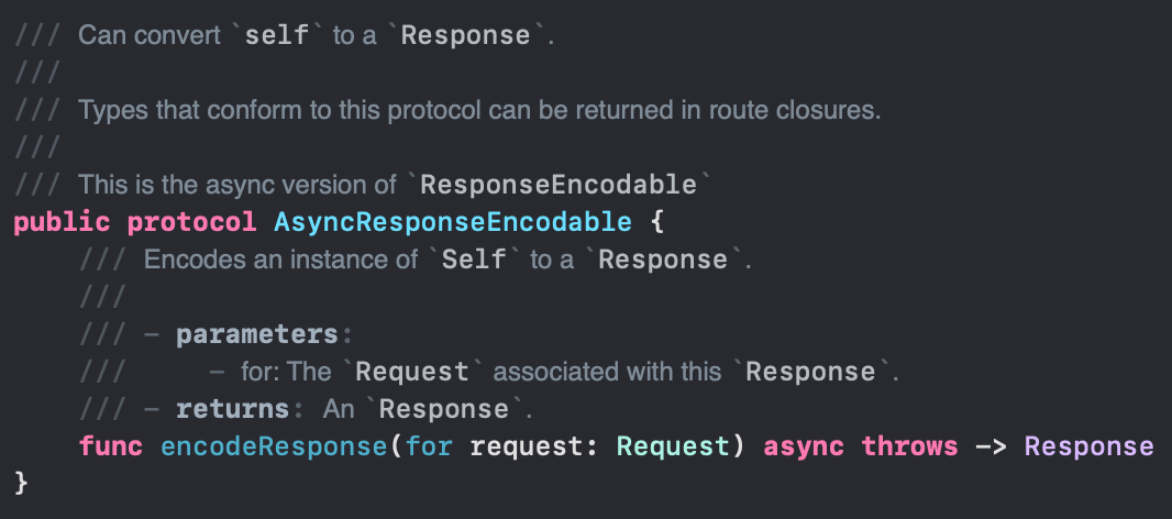 하단의 where절을 보면 Response타입이 AsyncResponseEncodable을 따르도록 되어있다.