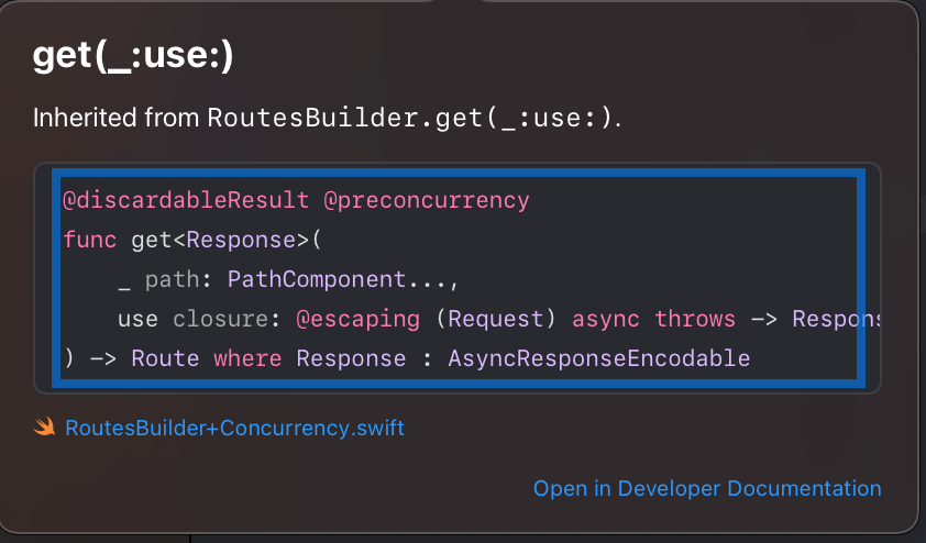 path값을 여러 개 전달할 수 있는 걸 보니 get("api", "sample") { req async in ~~~ } 같은 방식으로 사용하면 될 것 같다.