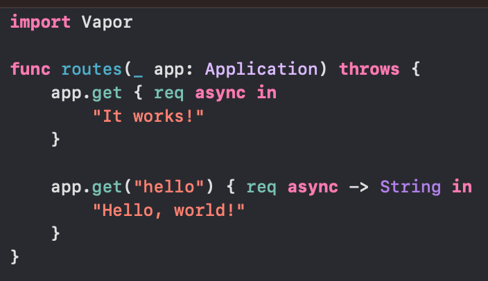 먼저 기존 routes.swift에 작성된 코드를 보니 처음 http://127.0.0.1:8080에서 노출되었던 "It works!"가 여기에서 문자열을 반환하고 있음을 알 수 있었다. 추가로 하단에 hello인 것을 보아 http://127.0.0.1:8080/hello/ 경로로 진입하면 "Hello, world!" 문자열을 페이지에서 출력하고 있을 것 같았다.