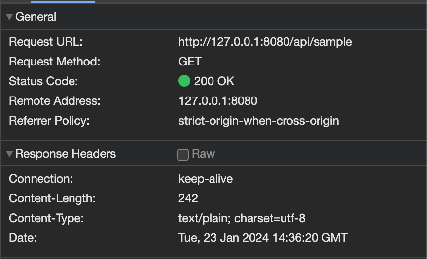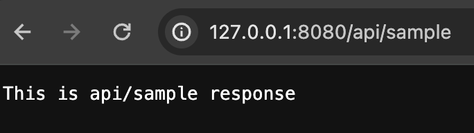 아래와 같이 127.0.0.1:8080/api/sample 접속 시 아래처럼 Response가 표시된 것을 확인할 수 있다.