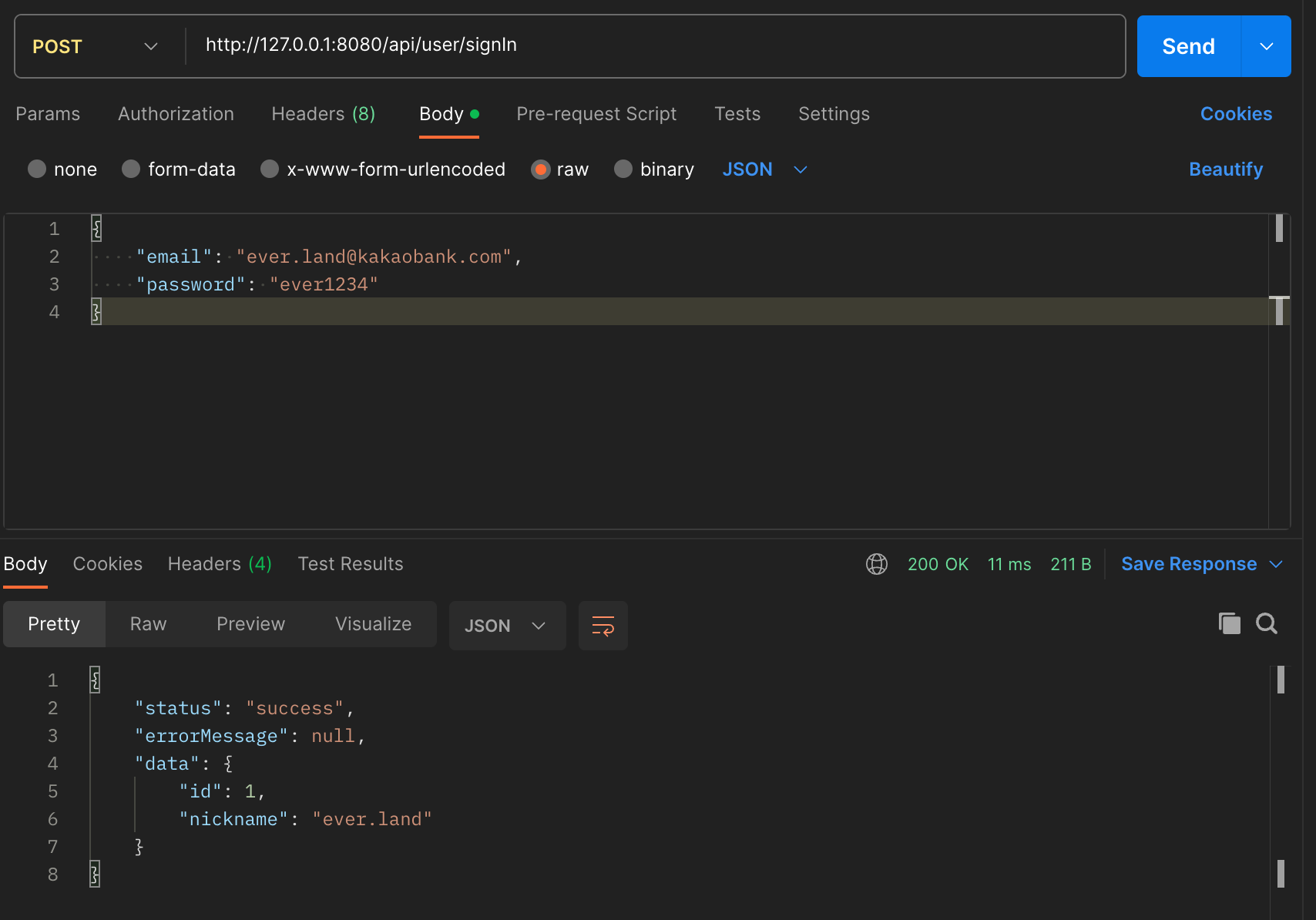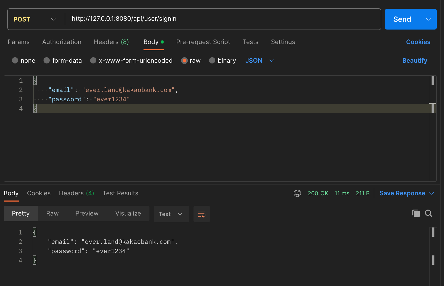 위와 같이 email, password를 json형식으로 날리게 되면, 예상했던 대로 req.body.string이 그대로 response로 내려오는 것을 확인할 수 있다.