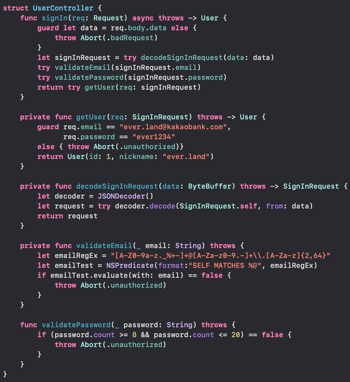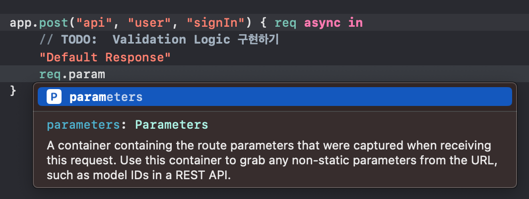 Error를 따로 만들어서 쓰려고 하다가 귀찮아서 문서를 보니 Abort라는 구조체를 제공하고 있었다. 일반적으로 HTTP Response에서 상태별로 내려주는 코드 및 메시지를 사용할 수 있도록 잘 구현되어 있어서 추가 구현 없이 사용이 가능해 보였다. 클라이언트와 달리(원래 에러 처리를 신경 쓰면서 개발하지는 않았어서) Vapor에서 제공하는 코드들은 기본적으로 에러를 염두에 두고 작성되어 있는 것 같다.