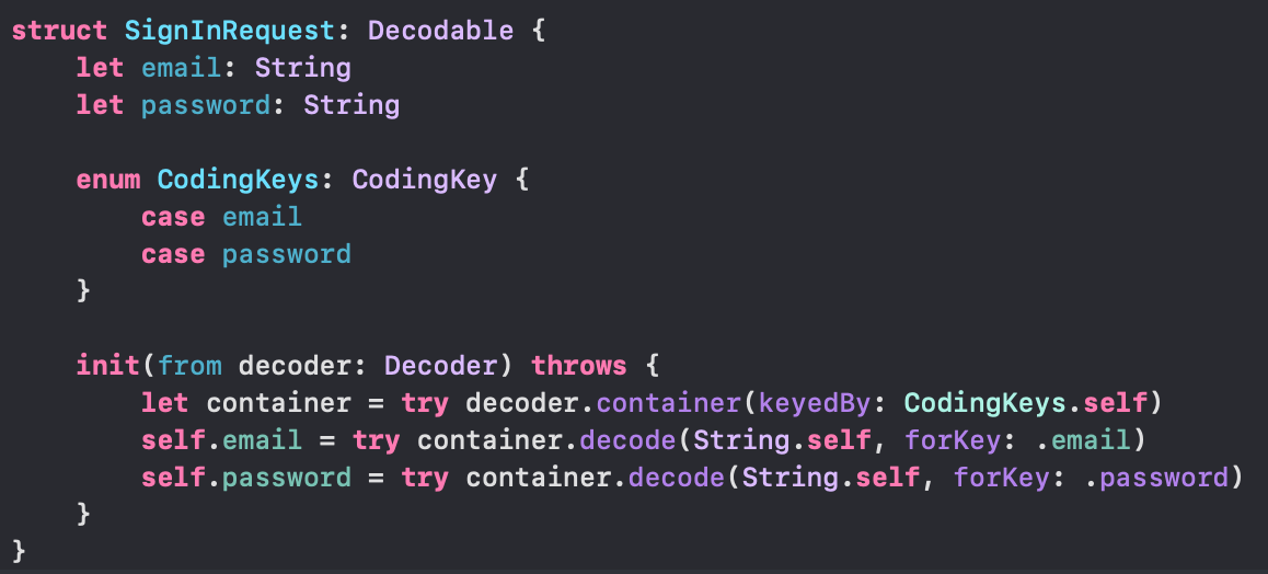 생각해 보니, 클라이언트에서 Request 및 Response 구조체를 각각 정의했던 것 처럼, 당연히 백앤드에서도 Request, Response에 대한 구조체를 정의해줘야했다. 그래서 로그인 리퀘스트에 대한 구조체 및 반환할 User에 대한 구조체를 다음과 같이 정의했다.