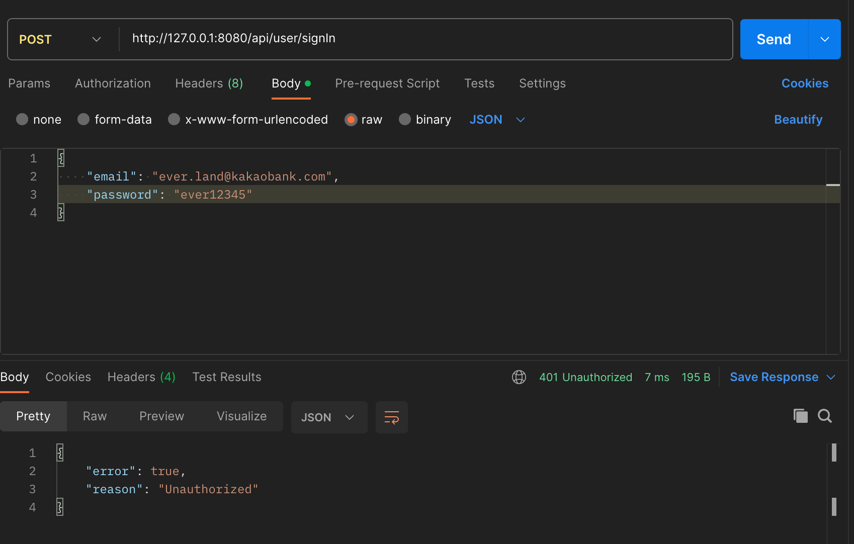 물론 비밀번호를 잘못 입력했을 경우의 실패케이스도 아래처럼 정상 작동하는 것을 확인할 수 있다.