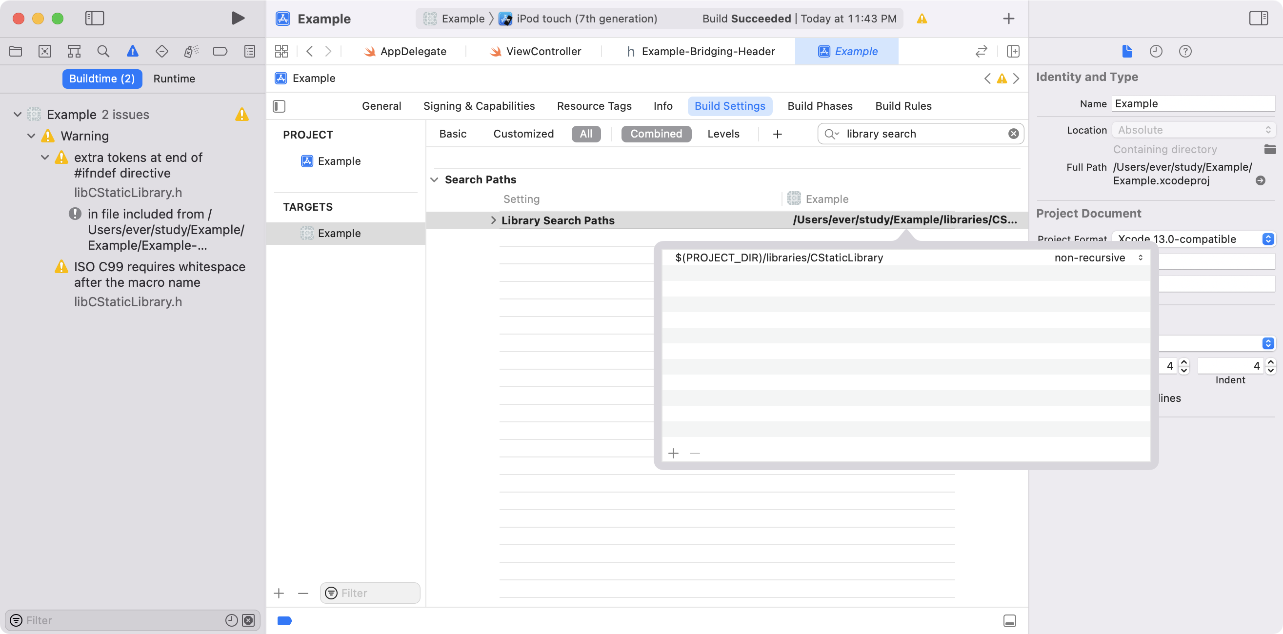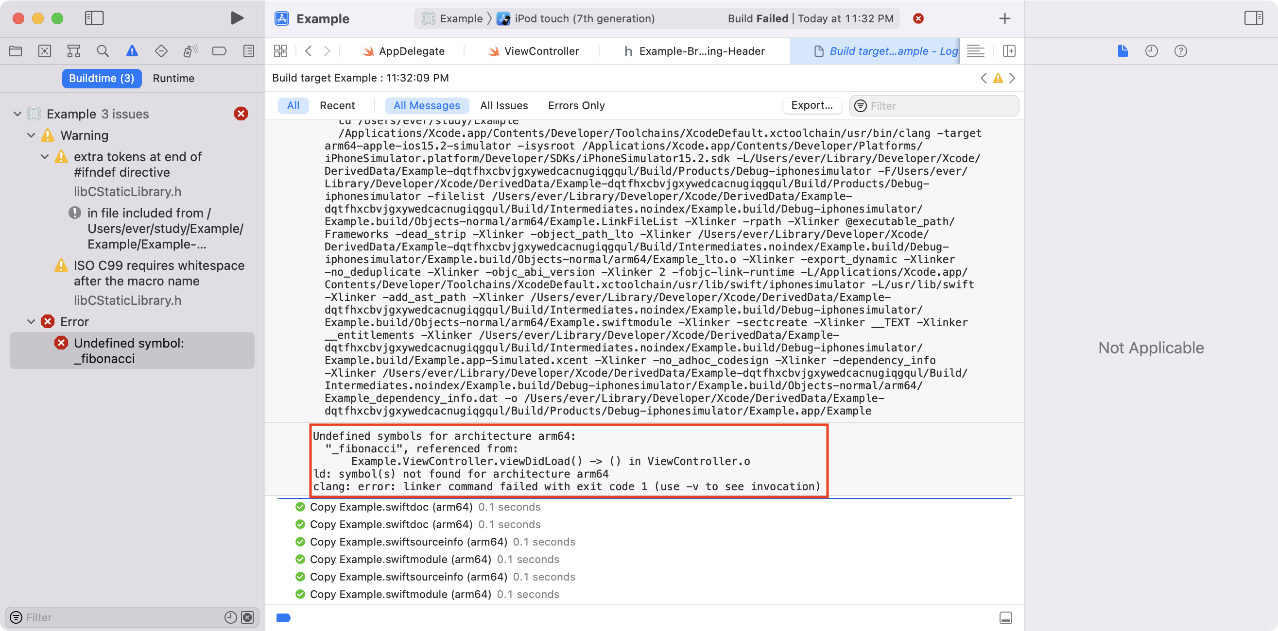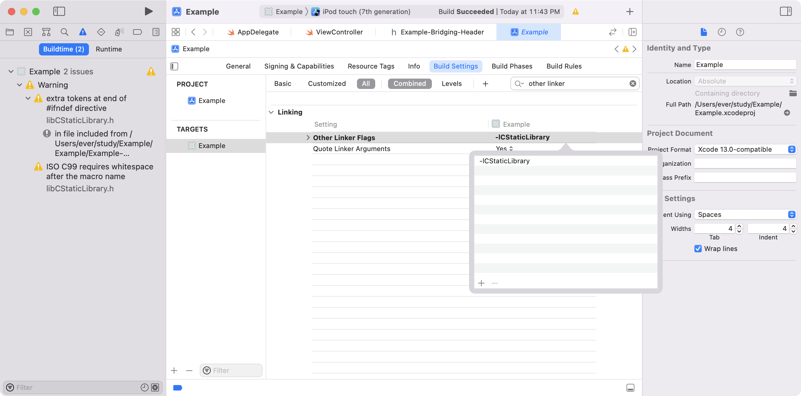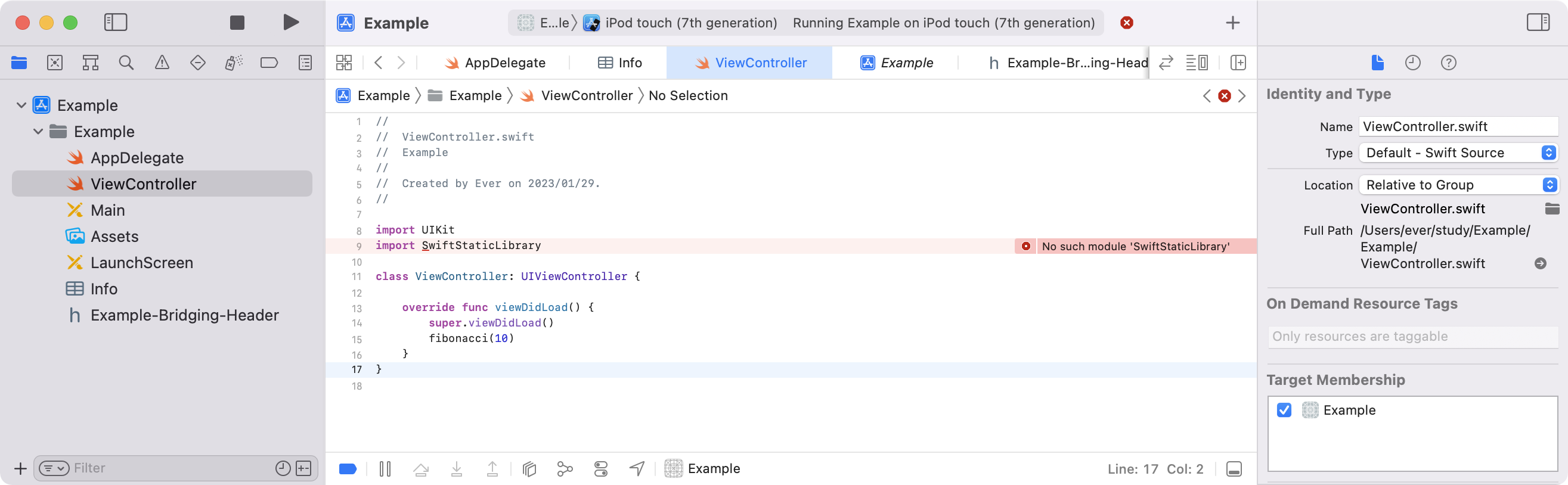 컴파일 시 헤더파일은 잘 포함돼서 _fibonacci라는 심볼(undefined)이 있음을 확인했고, ViewController.swift의 viewDidLoad에서 호출할 수 있지만, LD(링커)의 링킹 과정에서 이 심볼을 Resolve시켜주지 못했기 때문에 위와 같은 오류가 발생한다. 이를 해결하기 위해서는 libCStaticLibrary.a파일을 링커에 전달해주어야 한다.