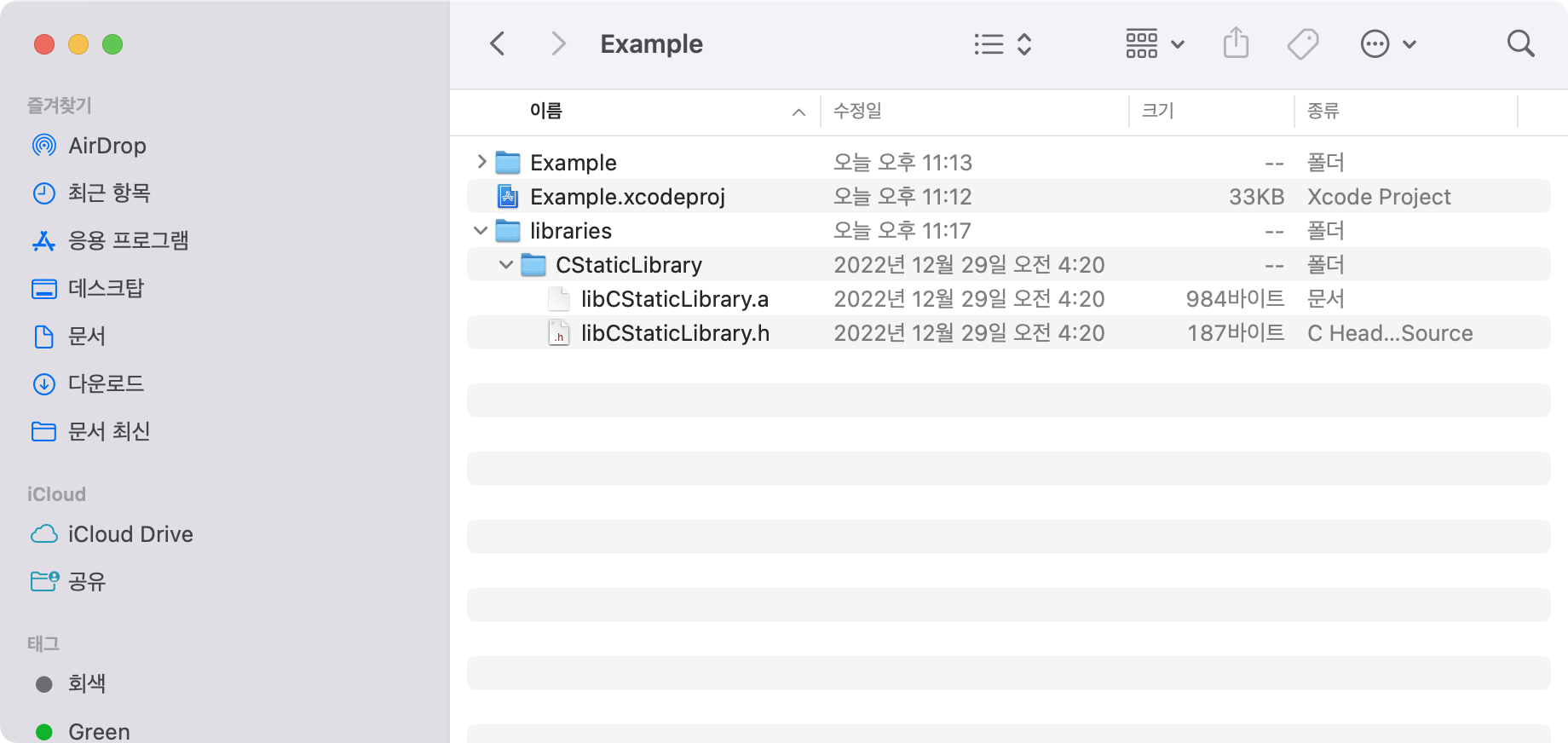 작성한 쉘 스크립트를 실행하면 아래처럼 product/CStaticLibrary 디렉토리에 libCStaticLibrary.h 및 libCStaticLibrary.a파일이 생성된 것을 확인할 수 있다.