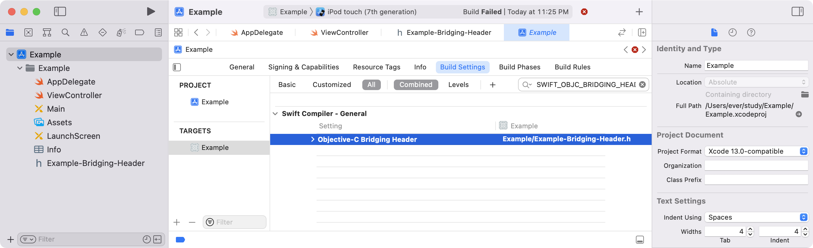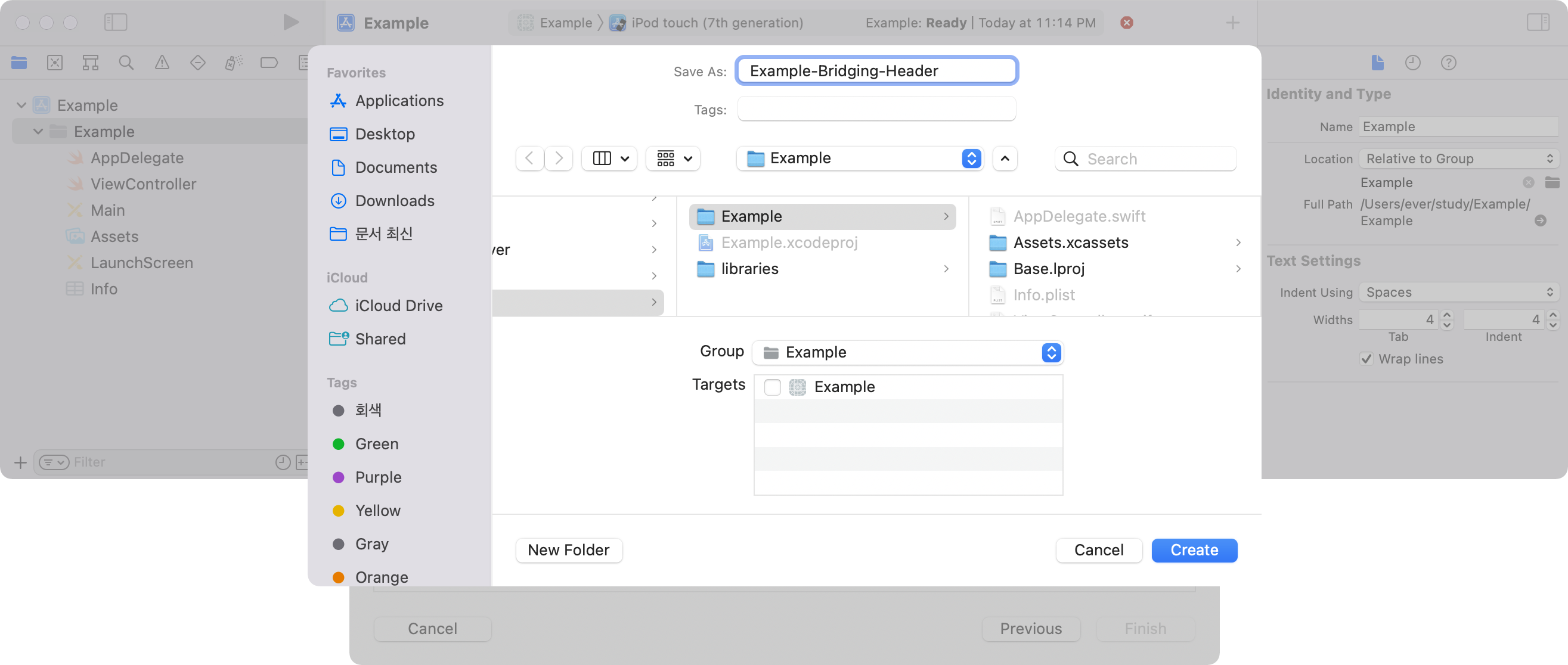 이제 생성된 헤더파일을 import하여 사용해야 하는데... Swift에서는 이 헤더파일을 바로 import할 수 없다. 대신, ObjC에서는 헤더파일을 import해서 사용할 수 있는데 https://developer.apple.com/documentation/swift/importing-objective-c-into-swift에 따르면 프로젝트에서 어떤 언어를 주로 사용하는지에 상관없이 Swift와 ObjC를 같이 사용하기 위해 bridging header를 사용하면 된다고 나와있다.