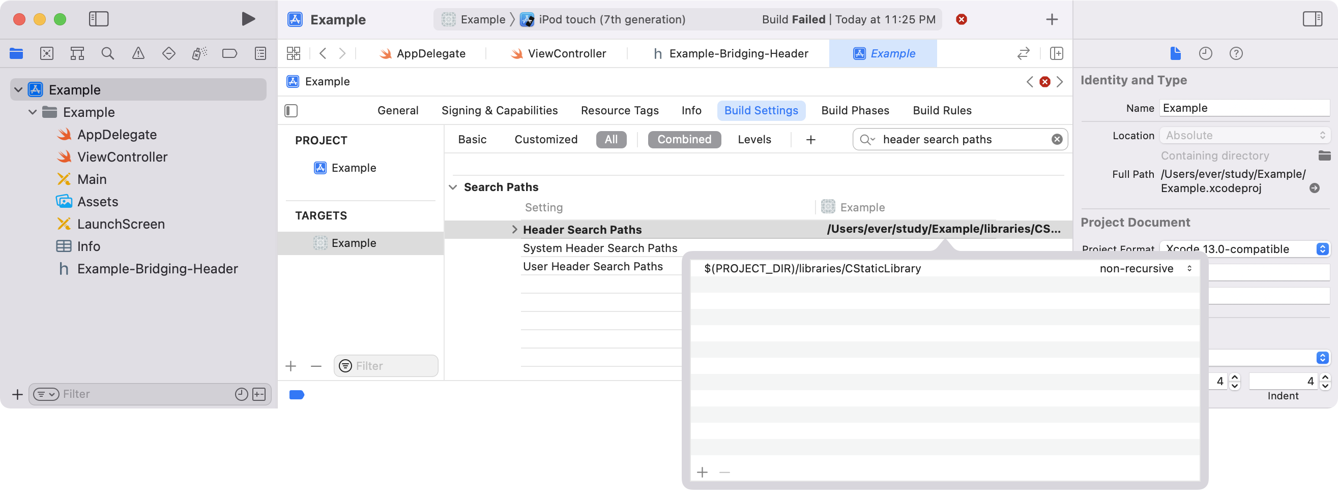 이를 해결하기 위해선 libCStaticLibrary.h의 경로를 명시해주어야 하는데, 헤더파일 경로는 project 디렉토리의 libraries/CStaticLibrary였으므로 Build Settings에서 다음처럼 header search path를 추가해 주자.