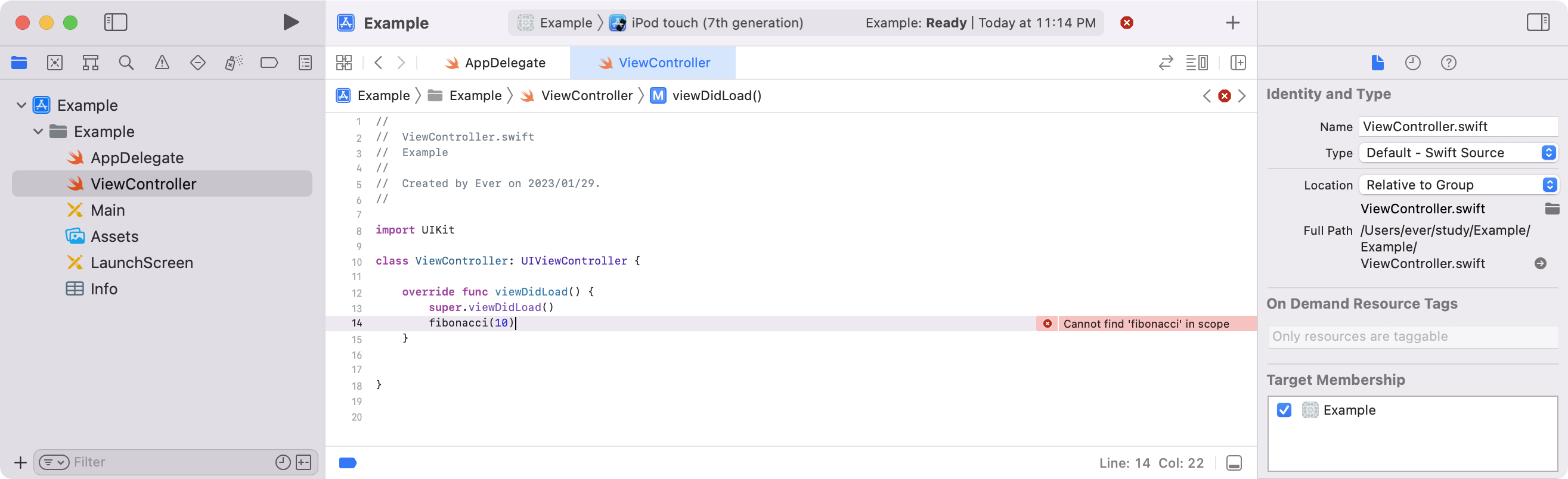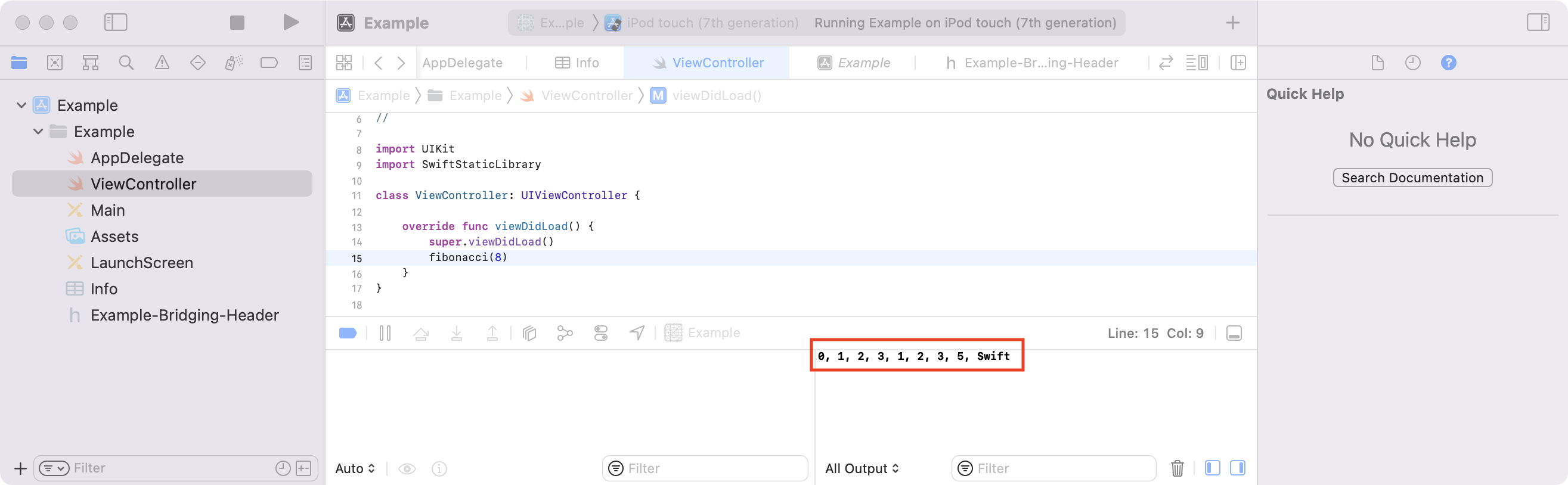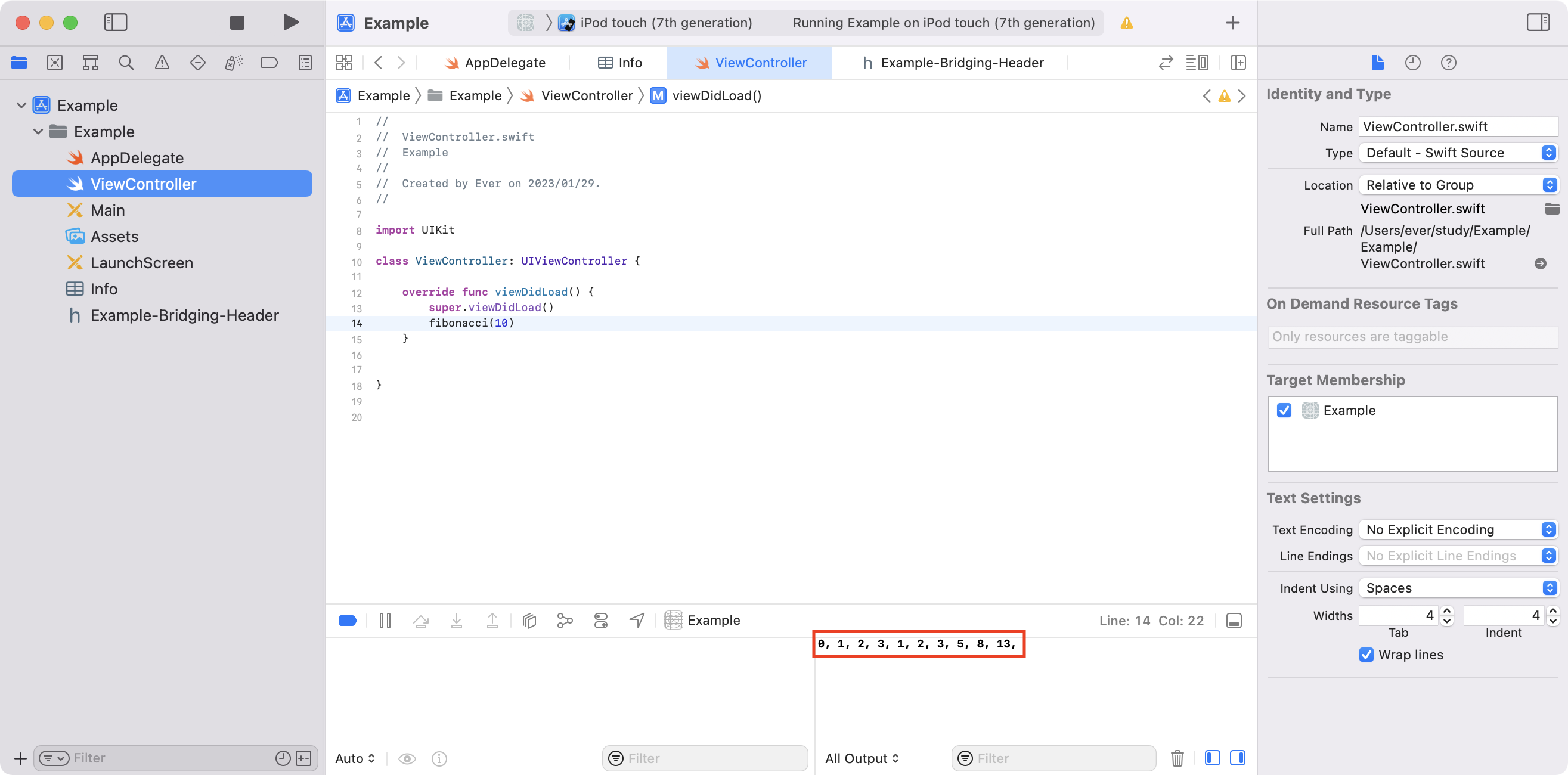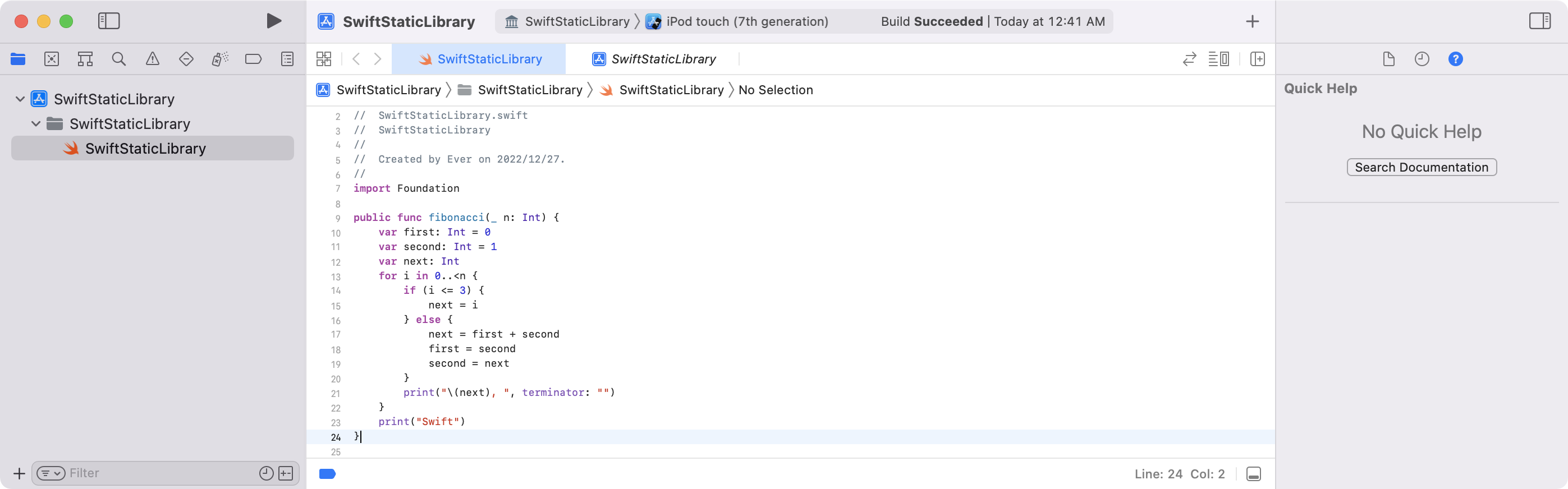 앞서 C언어에서 작성했던 피보나치수열 출력 함수를 Swift로 작성한 후 Static Library로 빌드하여 다른 Swift 프로젝트(Example)에서 import 하도록 해보자.