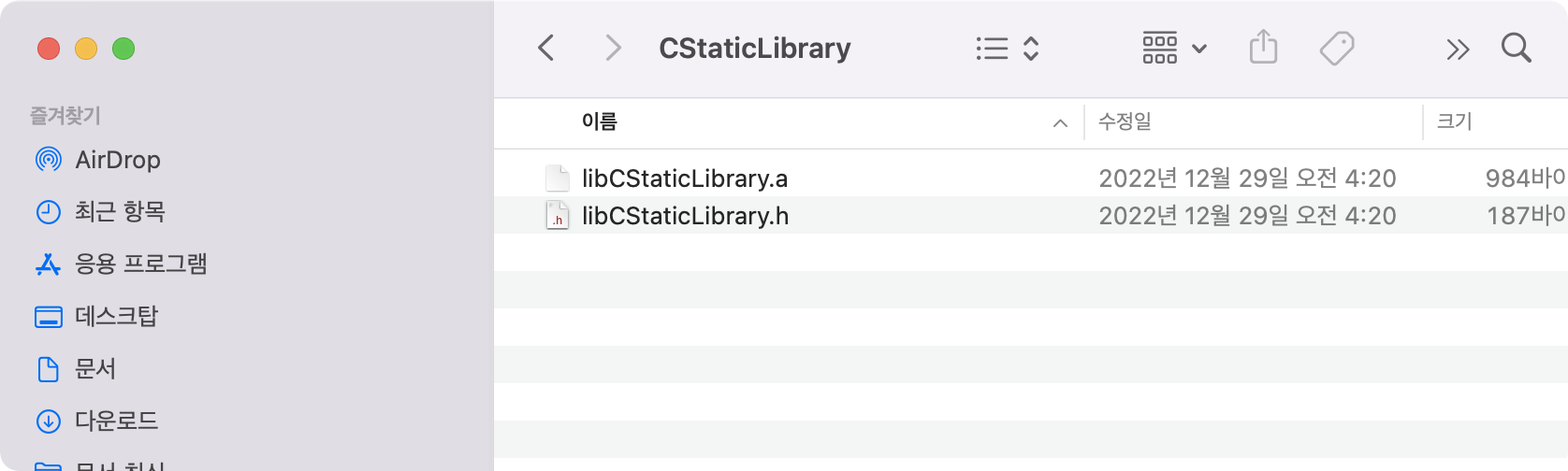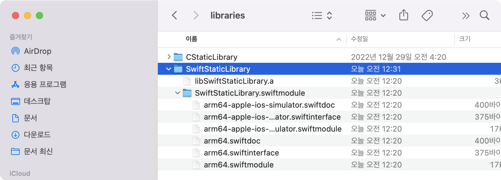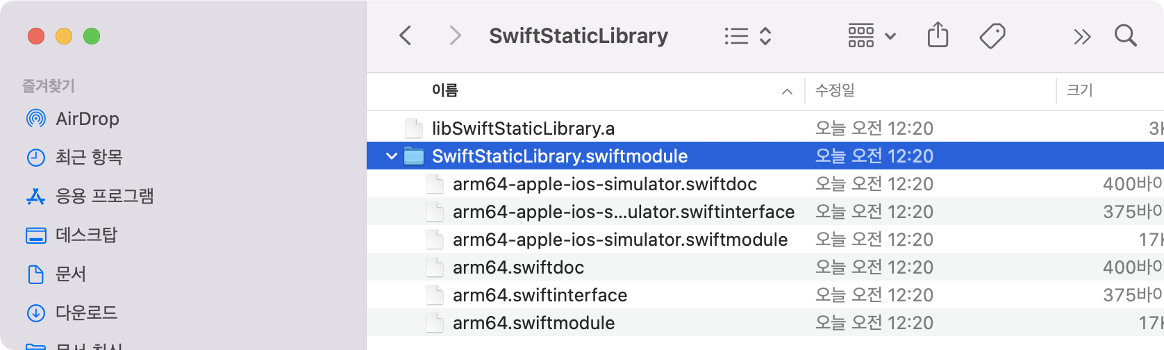 위의 쉘 스크립트를 실행해 보면 C와 마찬가지로 product/SwiftStaticLibrary 디렉토리에 아래와 같이 파일이 생성되어 있음을 확인할 수 있다.