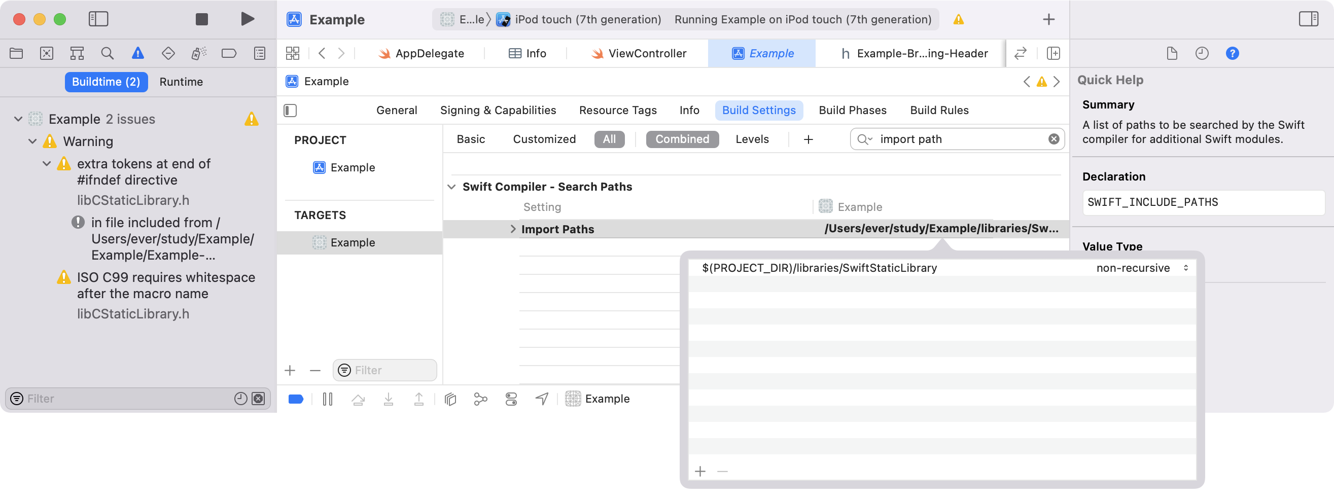 1. Library Search Path: -I(대문자 i) = $(PROJECT_DIR)/libraries/SwiftStaticLibrary