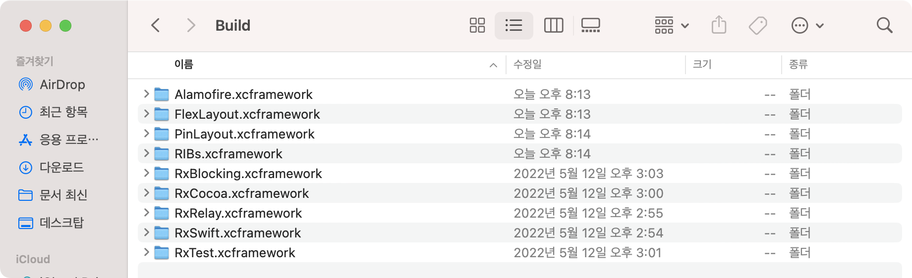 RIBs까지 빌드가 성공했다. 각각의 빌드를 위해 필요한 의존성까지 포함해 빌드된 xcframework를 살펴보면 아래와 같다.