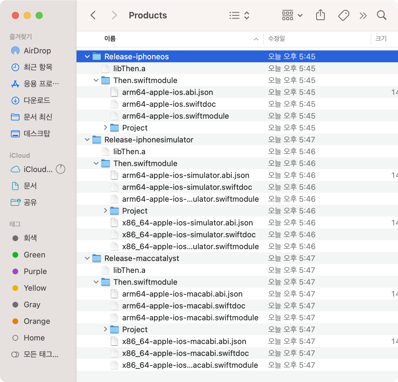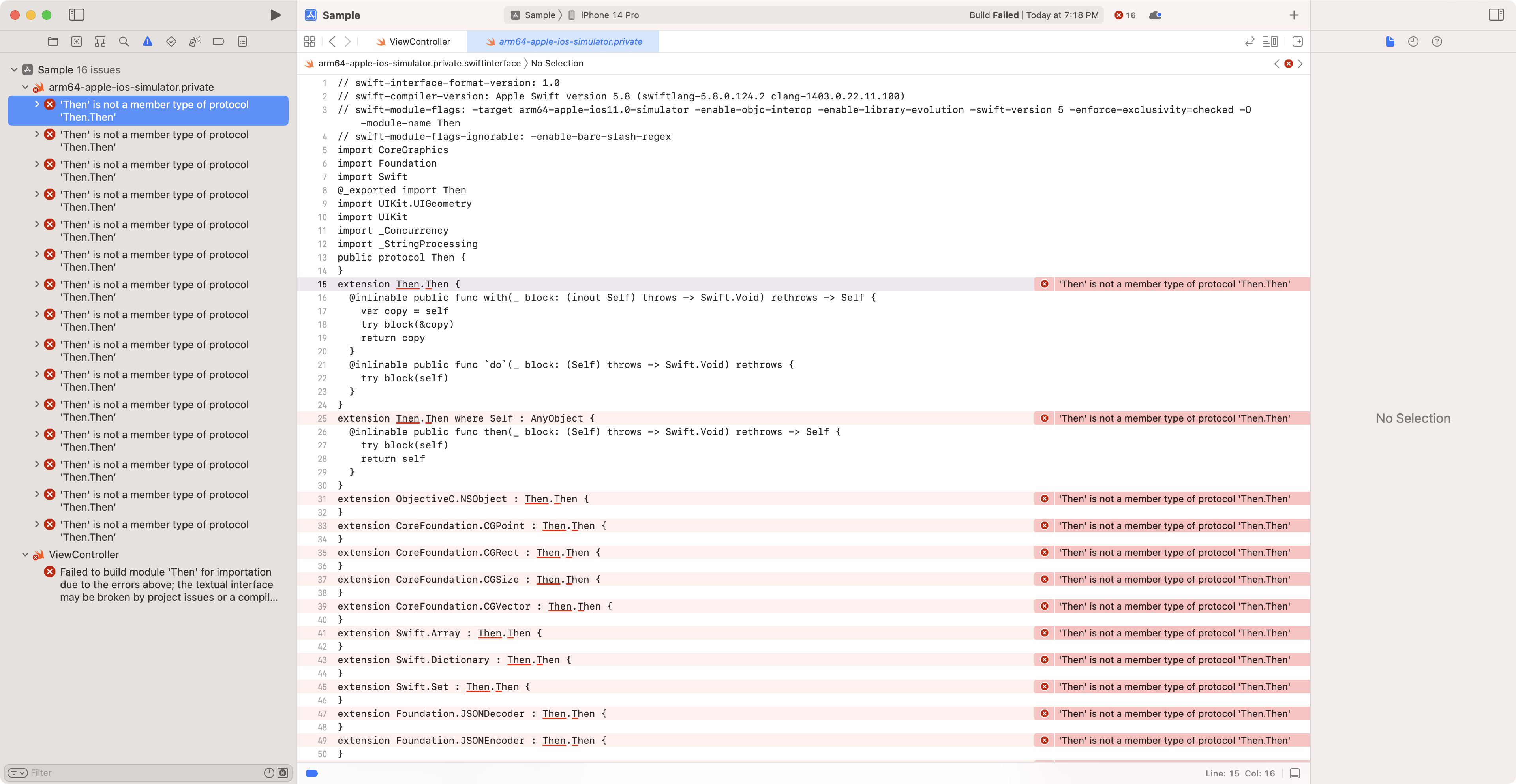 역시 한 번에 성공하는 일이 없다 ㅎㅎ. Swift의 모듈 네임과 인터페이스 네임인 Then이 겹쳐서 생기는 문제라고 한다. 다른 글을 참고해 보니 겹치지 않도록 swiftinterface 파일에서 모두 겹치는 Then을 지워버리는 방법이 있다고 한다. (안전한 방법은 아닐 거라고 생각하지만... 사실 CocoaPod이나 SwiftPM에서는 어떻게 이런 문제를 해결했는지 궁금하다.)