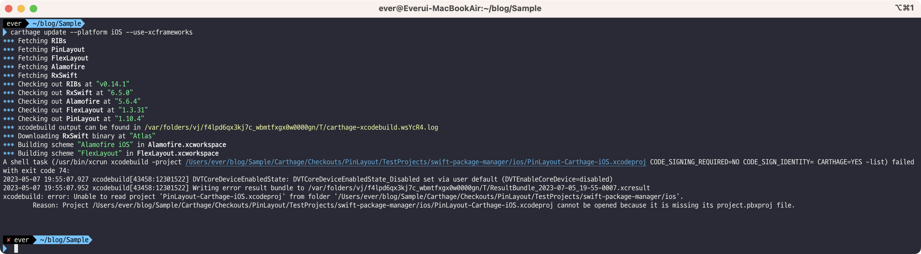 Then 하나만 의존성으로 추가하는데 너무 많은 시간을 써버려서.... 나머지 의존성에 대한 xcframework 생성의 Carthage의 도움을 이용해 생성했다.
