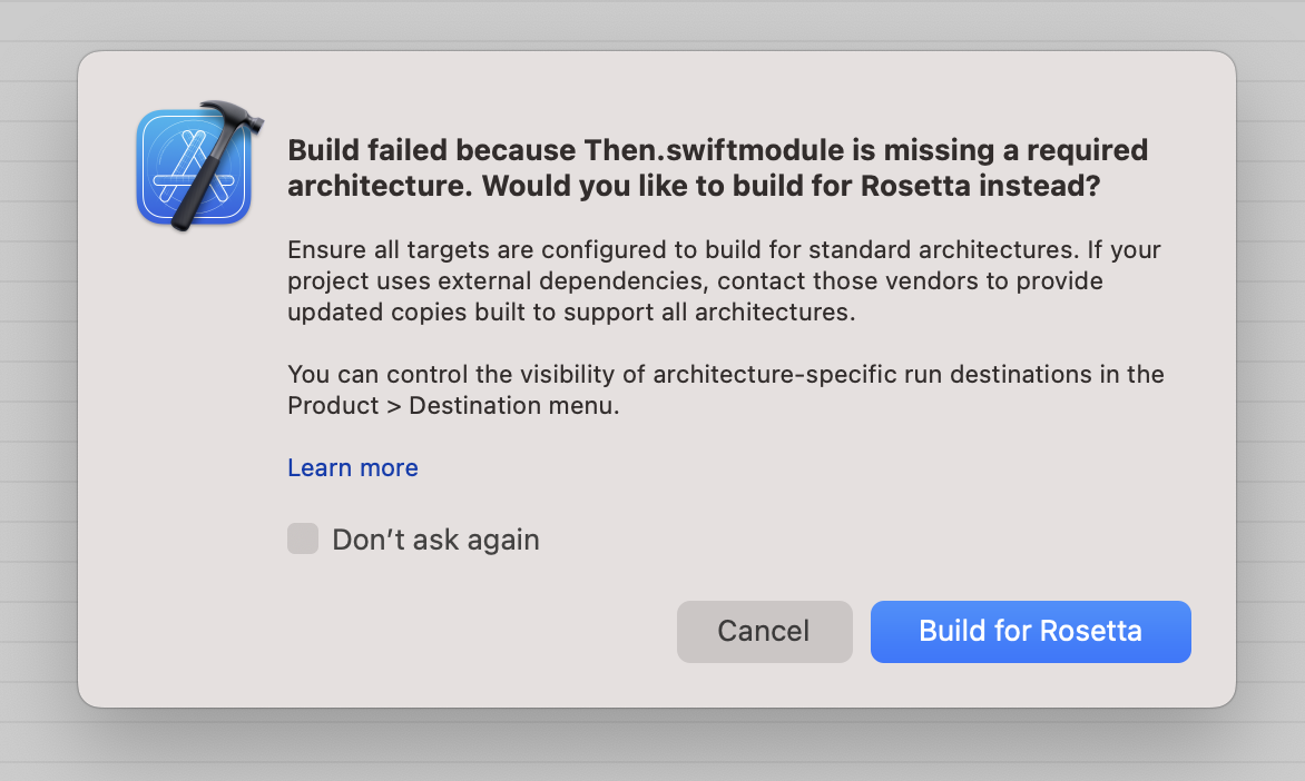 fat library 생성 후 각각 빌드된 swiftmodule파일을 import하도록 해도 이미 EXCLUDED_ARCHS에서 제외된 아키텍쳐를 빌드하려고 시도한다면 위와 같은 에러를 출력한다.