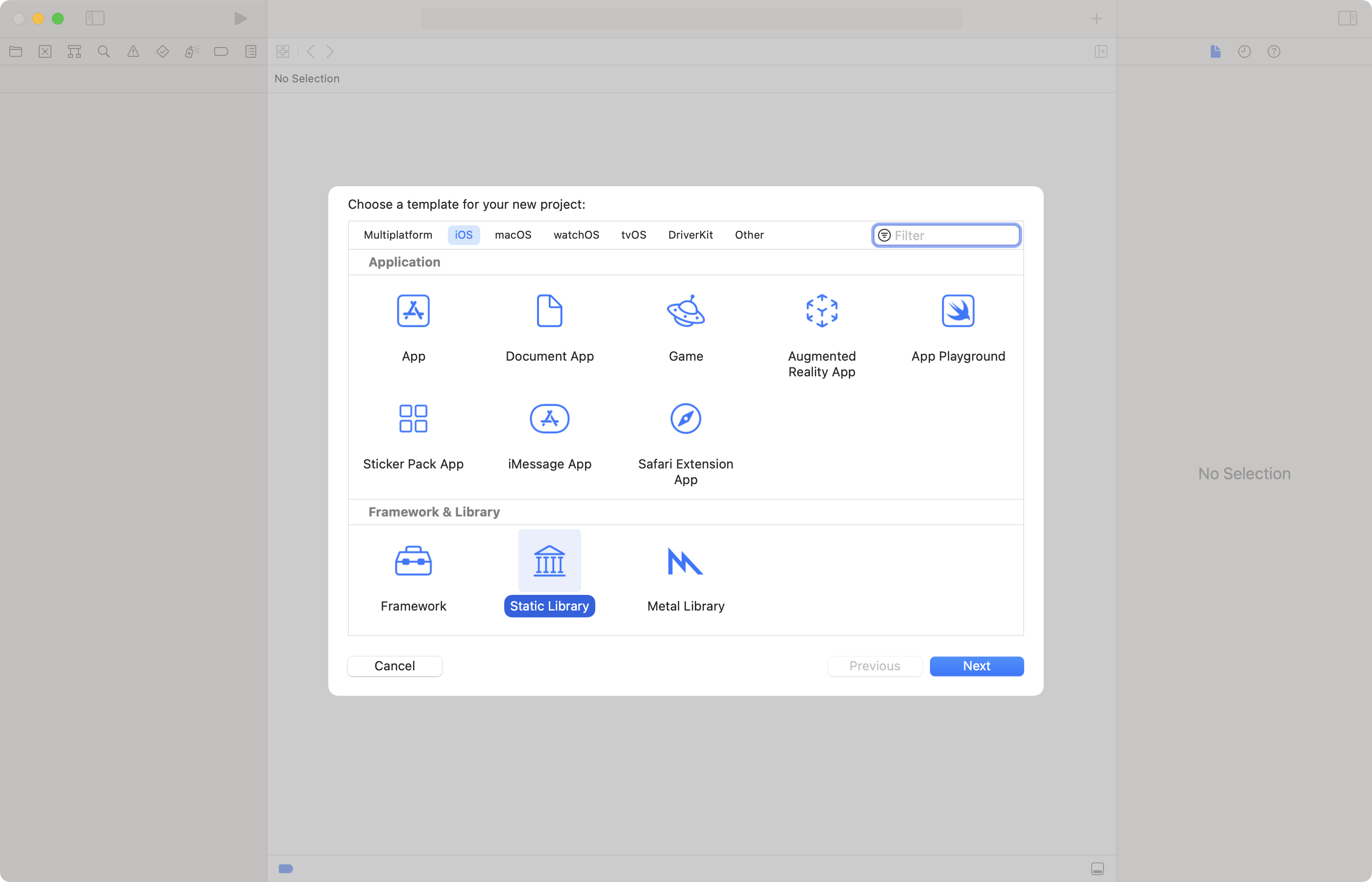 근데 라이브러리도 XCFramework처럼 멀티 아키텍쳐를 지원할 수 있나...? 하고 찾아보니 fat library가 있다고 한다. 요건 이따가 좀 더 살펴보고.. Then이라는 이름으로 Static Library를 만들어보자