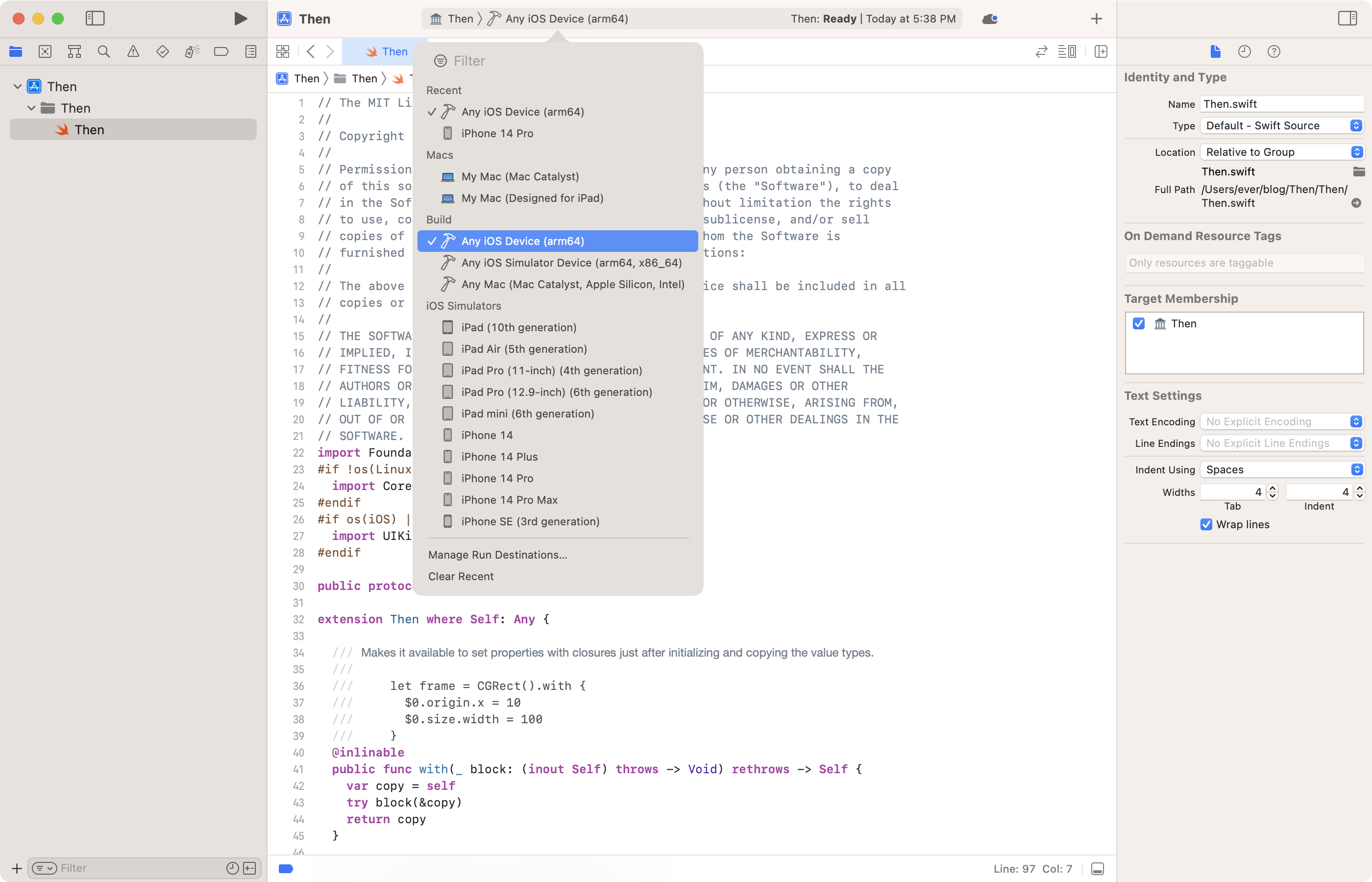 빌드를 시도하려고 보니 Sources/Then/Then.swift 파일 하나만 있다.... 다른 프레임워크들은 프로젝트의 형태로 제공되어 아키텍쳐별 빌드 및 XCFramework로 합쳐주면 되지만 이건 라이브러리 또는 프레임워크 프로젝트를 별도로 생성해서 빌드해야 한다. 먼저 라이브러리 프로젝트를 만들어서 시도해 보자.